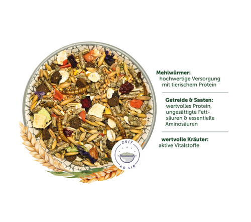 Hafer, Gerste, Plata Hirse, Kanariensaat, Erbsenflocken, Gerstenflocken, Mais gebrochen, Haferkerne, Weizenkleie, Weizen, Karotten, Geflügelprotein getrocknet, Sonnenblumenextraktionsschrot, Mais, Silberhirse, Rote Hirse, Grassaat, Leinsaat, Luzernegrünmehl, Pastinaken, Mineralstoffe, Sonnenblumensaat, Kartoffeln getrocknet, Biertreber, Karottentrester, Kartoffeleiweiß, Rote Bete, Erbsenmehl, Rübenfasern, Bierhefe inaktiviert, Löwenzahnkraut, Luzerneklee, Schafgarbenkraut, Sesamsaat, Chicorée Inulin, Paprika, Tapioka getrocknet, Apfel, Mehlwürmer (0,3%), Kamillenblüten, Hagebuttenschalen, tierisches Protein hydrolisiert (Fisch, Geflügel), Johannisbrot, Malvenblüten, Gefllügelleber hydrolysiert, Chicorée-Wurzel gemahlen (Getreide 49%, Saaten 23%, Kräuter 1,5%)