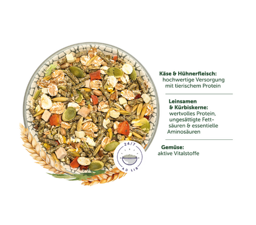 Hafer, Mais gebrochen, Weizen, Gerste, Erbsenflocken, Weizenkleie, Gerstenflocken, Dinkelflocken, Leinsaat (3,8%), Kürbiskernsaat geschält (3,5%), Sonnenblumenextraktionsschrot, Mais, Weizenflocken, Luzernegrünmehl, Sonnenblumensaat, Calciumcarbonat, Biertreber, Paprika, Karotten, Karottentrester, Bierhefe inaktiviert, Luzerneklee, Spitzwegerichblätter, Chicorée Inulin, Hühnerfleisch getrocknet (0,5%), Käse getrocknet (0,5%), Kamillenblüten, Kartoffeleiweiß, Apfel, Rote Bete, Johannisbrot (Gemüse 8,6%)
