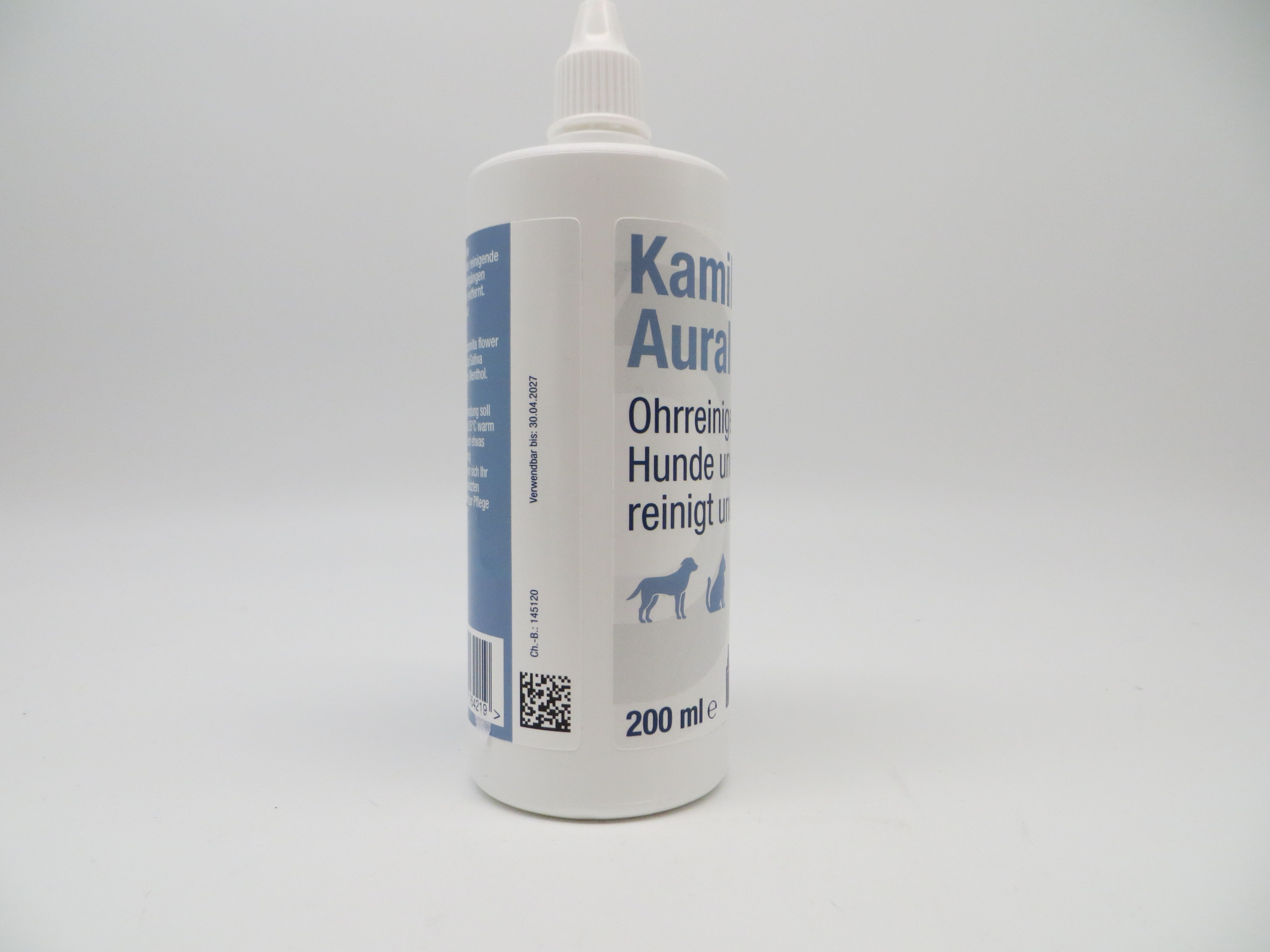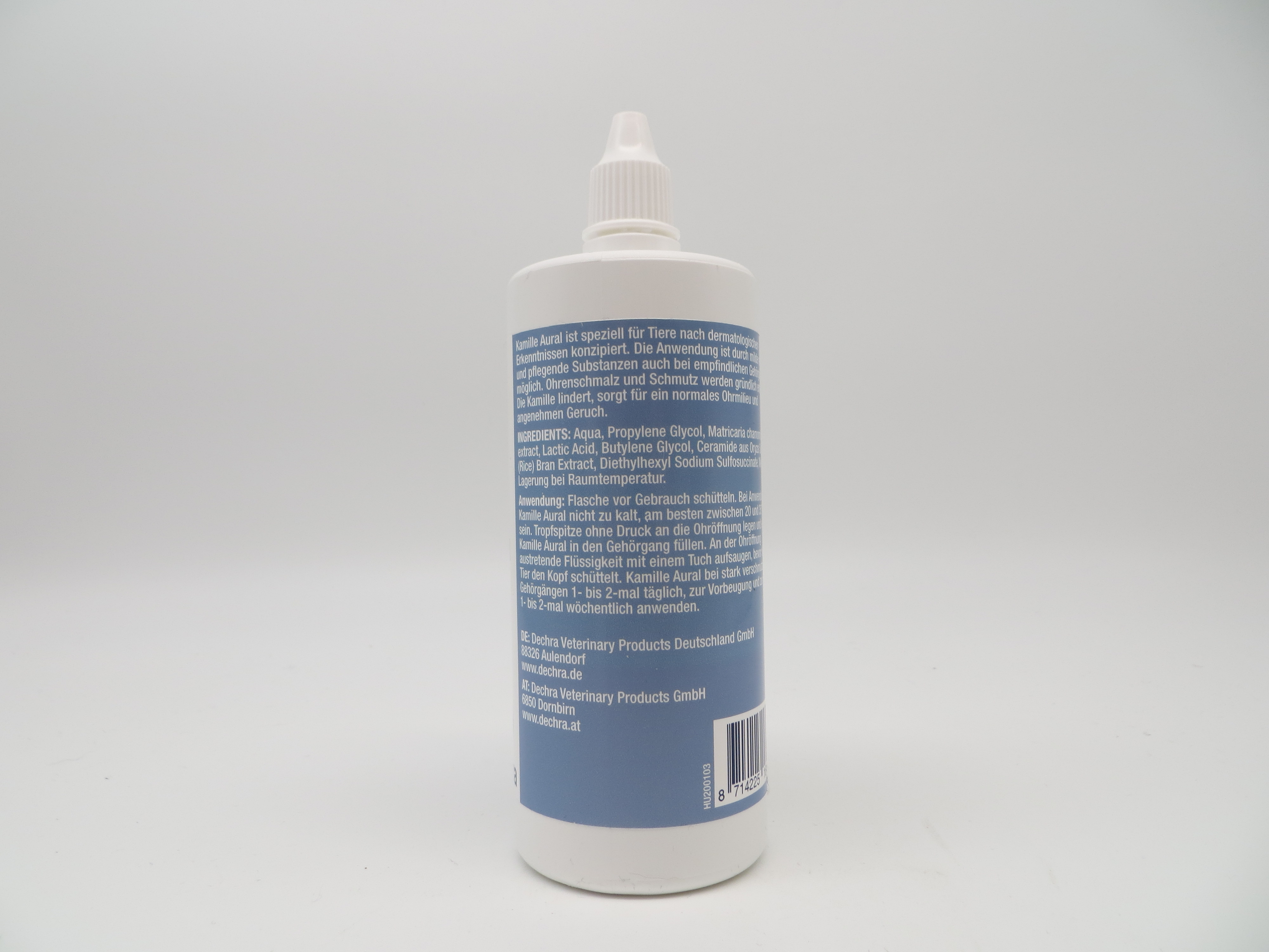 Tropfspitze ohne Druck an die Ohröffnung legen und etwas Kamille Aural in den Gehörgang füllen. An der Ohröffnung austretende Flüssigkeit mit einem Tuch aufsaugen, bevor sich Ihr Tier den Kopf schüttelt. Kamille Aural bei stark verschmutzten