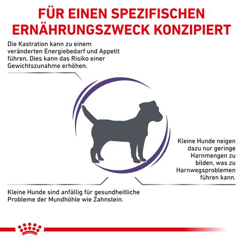 ROYAL CANIN Neutered Adult Small Dogs ist eine exakt ausgewogene Trockennahrung, die speziell für kastrierte Hunde kleiner Rassen (< 10kg) zur Unterstützung der Aufrechterhaltung eines optimalen Körpergewichts entwickelt wurde.