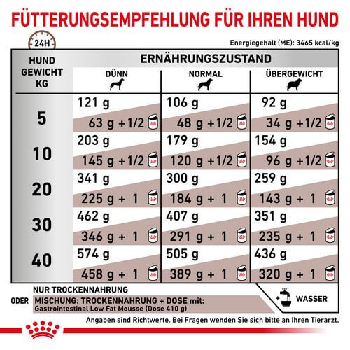 Um den individuellen Vorlieben aller Hunde gerecht zu werden, ist Royal Canin Gastrointestinal Low Fat auch als Feuchtnahrung mit einer weichen Mousse-Textur erhältlich.* Mischfütterung verleiht der Nahrung unterschiedliche Konsistenzen, was den Appetit anregen kann. Feuchtnahrung hat eine intensiveren Geruch und ihr Feuchtigkeitsgehalt trägt dazu bei, den Wasserhaushalt des Tieres zu regulieren. Trockennahrung hingegen kann in kleinen Portionen verabreicht werden, um eine Überlastung der Verdauung zu vermeiden.