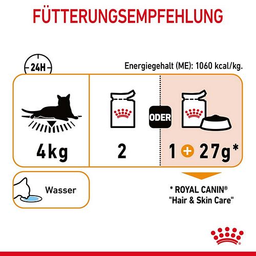 ROYAL CANIN Hair & Skin Care Mousse ist eine vollständige und ausgewogene Rezeptur, die speziell zur Unterstützung der Haut- und Fellgesundheit Ihrer Katze entwickelt wurde.