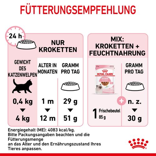 Um den individuellen Vorlieben verschiedener Katzen gerecht zu werden, ist Royal Canin Kitten auch als saftige Stückchen in Soße und Gelee oder weiche Mousse erhältlich. Wenn Sie eine gemischte Fütterung von Trocken- und Nassfutter in Betracht ziehen, befolgen Sie einfach unsere Fütterungsrichtlinien. So stellen Sie sicher, dass Ihre Katze die richtige Menge an Nass- und Trockenfutter erhält.