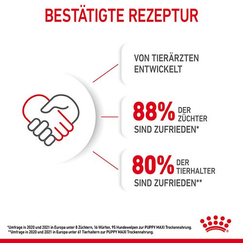 Um den individuellen Vorlieben verschiedener Hunde gerecht zu werden, ist ROYAL CANIN Maxi Puppy auch in Soße erhältlich. Wenn Sie eine Mischfütterung Ihrer Hunde in Betracht ziehen, befolgen Sie einfach unsere Fütterungsrichtlinien, um sicherzustellen, dass Ihr Hund die richtige Menge an Nass- und Trockennahrung erhält.