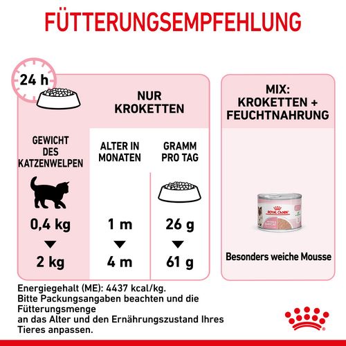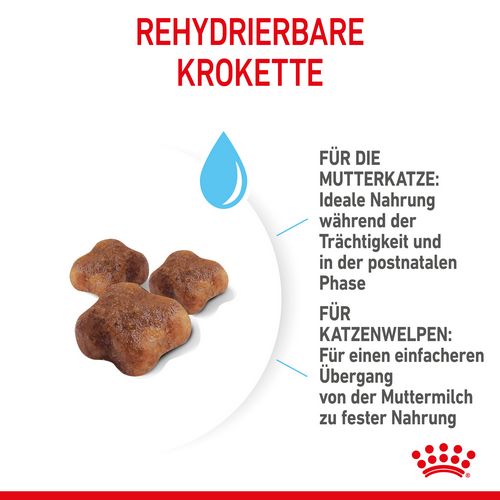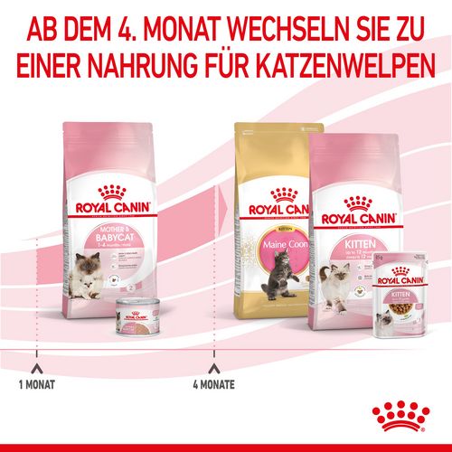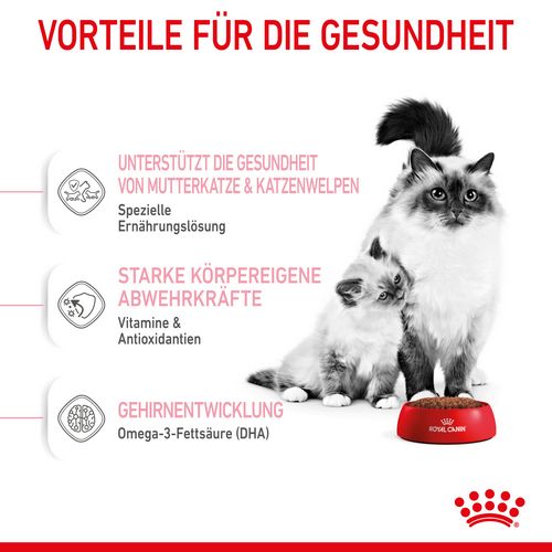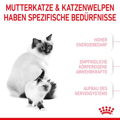 Royal Canin Mother & Babycat ist speziell auf die Ernährungsbedürfnisse der Katzenmutter und ihrer Kitten abgestimmt. Es eignet sich für trächtige bzw. säugende Katzen, sowie für 1 bis 4 Monate alte Kätzchen im ersten Lebensjahr.