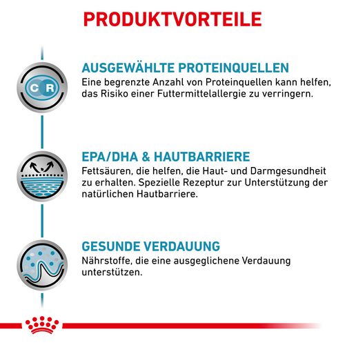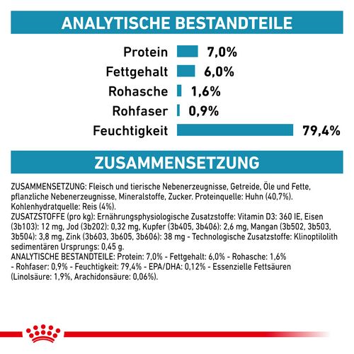 Bei diesem Produkt handelt es sich um eine tierärztliche Nahrung aus dem Sortiment Veterinary Health Nutrition von ROYAL CANIN. Dementsprechend ist es wichtig, dass das Futter nur auf Empfehlung einer Tierärztin oder eines Tierarztes gefüttert wird. So kann sichergestellt werden, dass Ihr Tier genau die Nahrung erhält, die es wirklich benötigt. Eine Nahrungsumstellung sollte sorgfältig und schrittweise über einen Zeitraum von 7–10 Tagen erfolgen. Achten Sie auf die korrekte Portionengröße – insbesondere bei Mischfütterung.