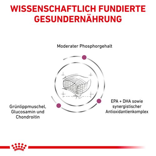 Mais, Weizenkleberfutter*, Maisfuttermehl, Weizen, Maiskleber, Tierfett, Geflügelprotein getrocknet, Lignozellulose, Reis, Geflügelprotein hydrolysiert, Zichorienfaser, Mineralstoffe, Fischöl, Sojaöl, Tomatenpülpe getrocknet (Quelle für Lycopen), Psyllium (Hüllschichten und Samen), Fructo-Oligosaccharide (0,5%), Neuseeländische Grünlippmuschel (GLM) getrocknet (0,3%), Hefe hydrolysiert (Quelle für Mannan-Oligosaccharide) (0,2%), Borretschöl, Glucosamin aus Fermentation, Tagetesmehl, Knorpel hydrolysiert (Quelle für Chondroitin). Proteinquellen: Weizenkleberfutter (15,7%), Maiskleber (7%), Geflügelprotein getrocknet (5,1%), Geflügelprotein hydrolysiert (4,5%).