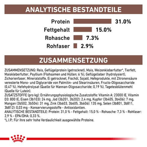 Geflügelprotein getrocknet, Reis, Mais, Weizenkleber, Tierfett, Maiskleber, Psyllium (Schalen und Samen; 6%), hydrolysierte Tierproteine, Zichorienpülpe, Mineralstoffe, Eipulver, Sojaöl, Hefenerzeugnisse, Fischöl, mit Zitronensäure veresterte Mono- und Diglyceride von Palmitin- und Stearinsäuren, Fructo-Oligosaccharide (0,47%), Algenöl Schizochytrium sp. (Quelle für DHA), Hefen (Quelle für Mannan-Oligosaccharide; 0,19%), Tagetesmehl. Leichtverdauliche Ausgangserzeugnisse: 76,5%.