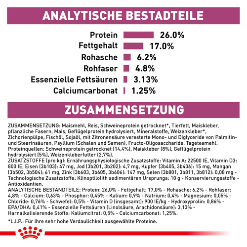 Bei diesem Produkt handelt es sich um eine tierärztliche Nahrung aus dem Sortiment Veterinary Health Nutrition von Royal Canin. Dementsprechend ist es wichtig, dass das Futter nur auf Empfehlung einer Tierärztin oder eines Tierarztes gefüttert wird. So kann sichergestellt werden, dass Ihr Tier genau die Nahrung erhält, die es wirklich benötigt. Eine Nahrungsumstellung sollte sorgfältig und schrittweise über einen Zeitraum von 7–10 Tagen erfolgen. Achten Sie auf die korrekte Portionsgröße – insbesondere bei Mischfütterung.
