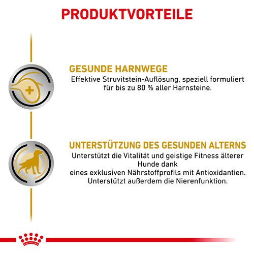 Royal Canin Urinary S/O Ageing 7+ ist eine ausgewogene und nährstoffreiche Rezeptur, die speziell dazu entwickelt wurde, älteren Hunden mit Harnproblemen wie Struvitkristallen und -steinen zu helfen.