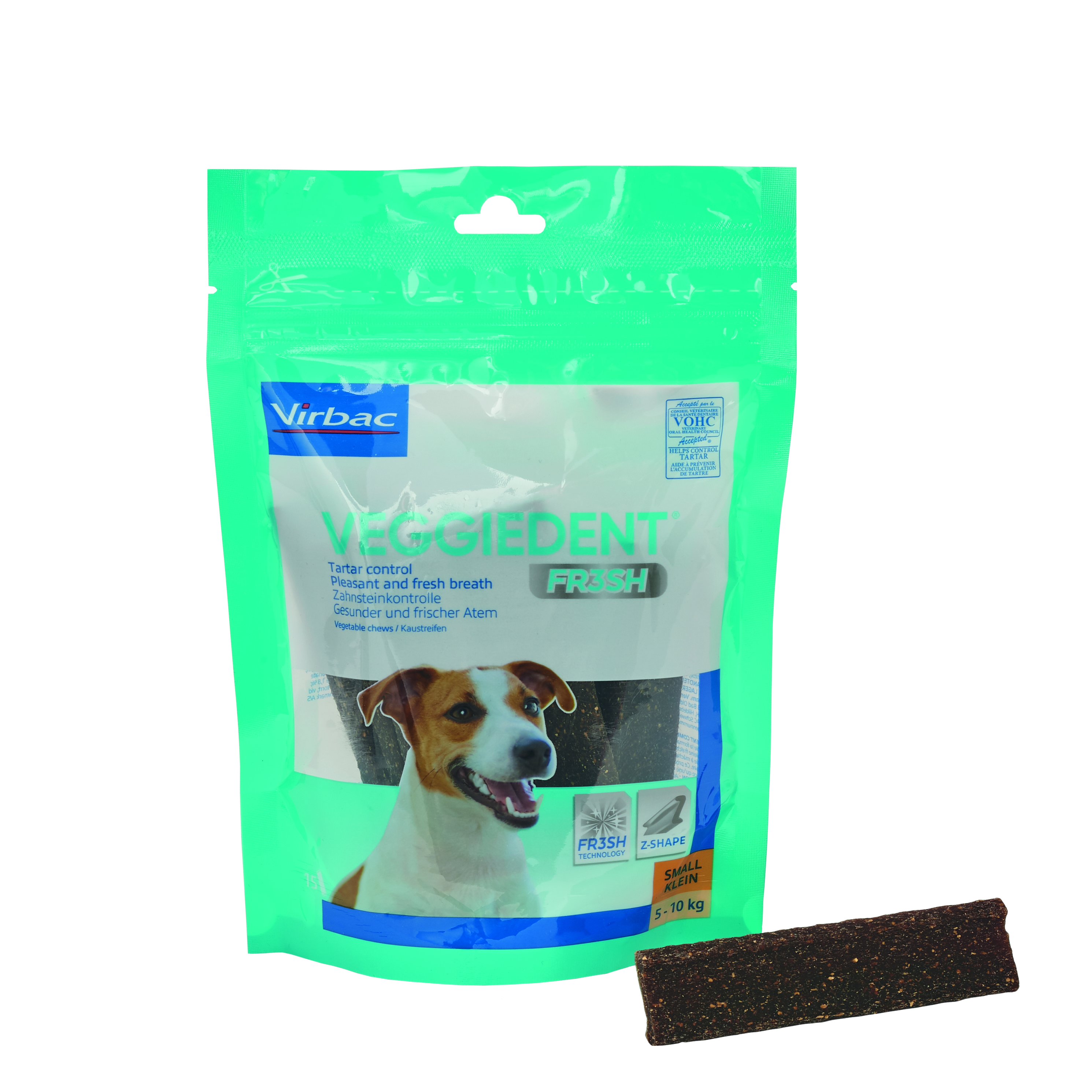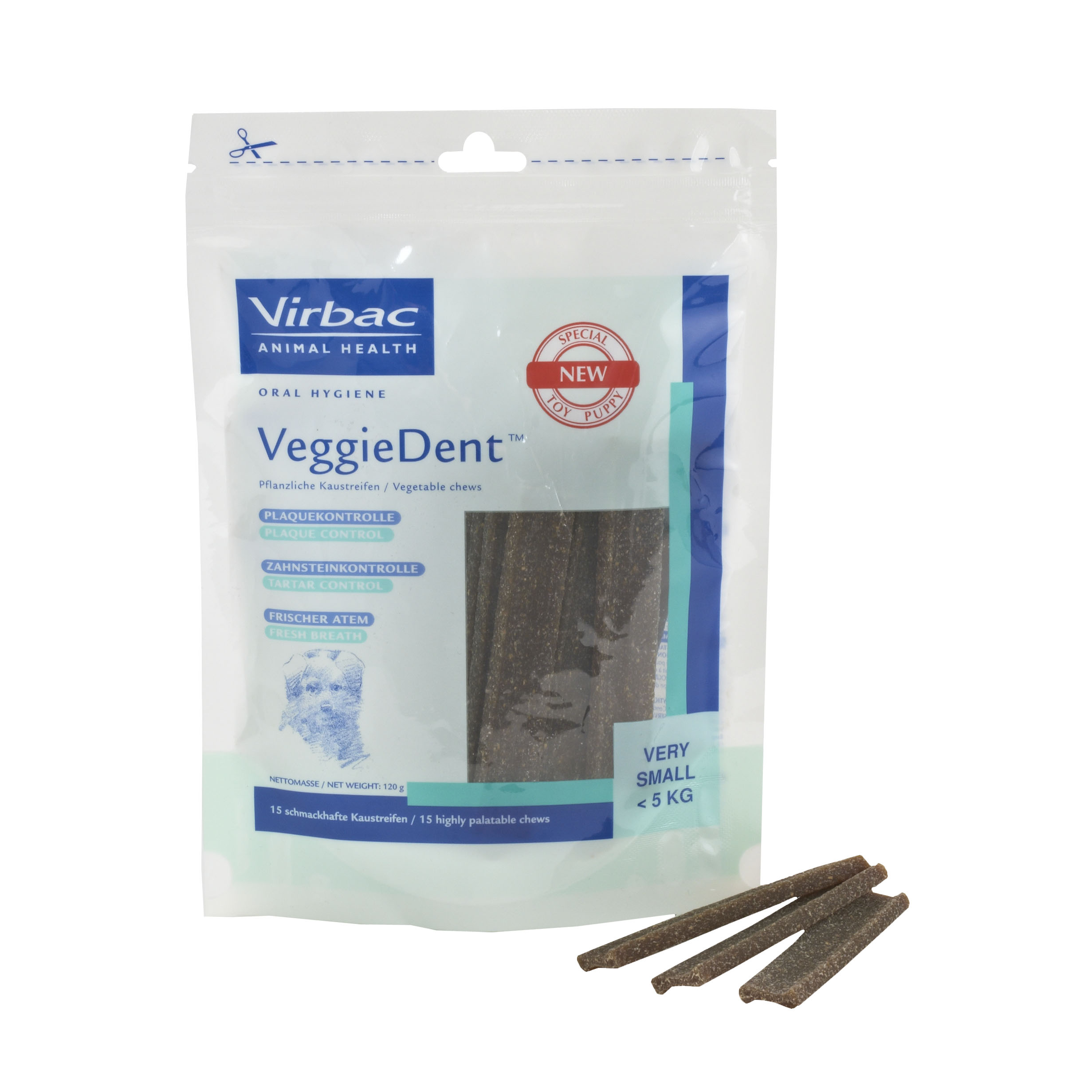 Die sehr schmackhaften VeggieDent-Kaustreifen erleichtern durch ihre Form und Textur das Kauen und fördern die Zahnreinigung. Die mechanische abrasive Wirkung der VeggieDent-Kaustreifen trägt dazu bei, die Plaque- und Zahnsteinbildung zu reduzieren und fördert als Folge davon einen frischen Atem.